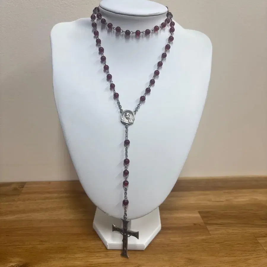 빨간색 비즈와 실버 십자가가 특징인 로자리오풍 목걸이. - 색상: 빨간색 비즈 - 소재: 실버 색상의 금속 - 디자인: 로자리오풍 목걸이 - 특징: 십자가 펜던트 포함 - 길이: 약 50cm 방문해 주셔서 감사합니다.