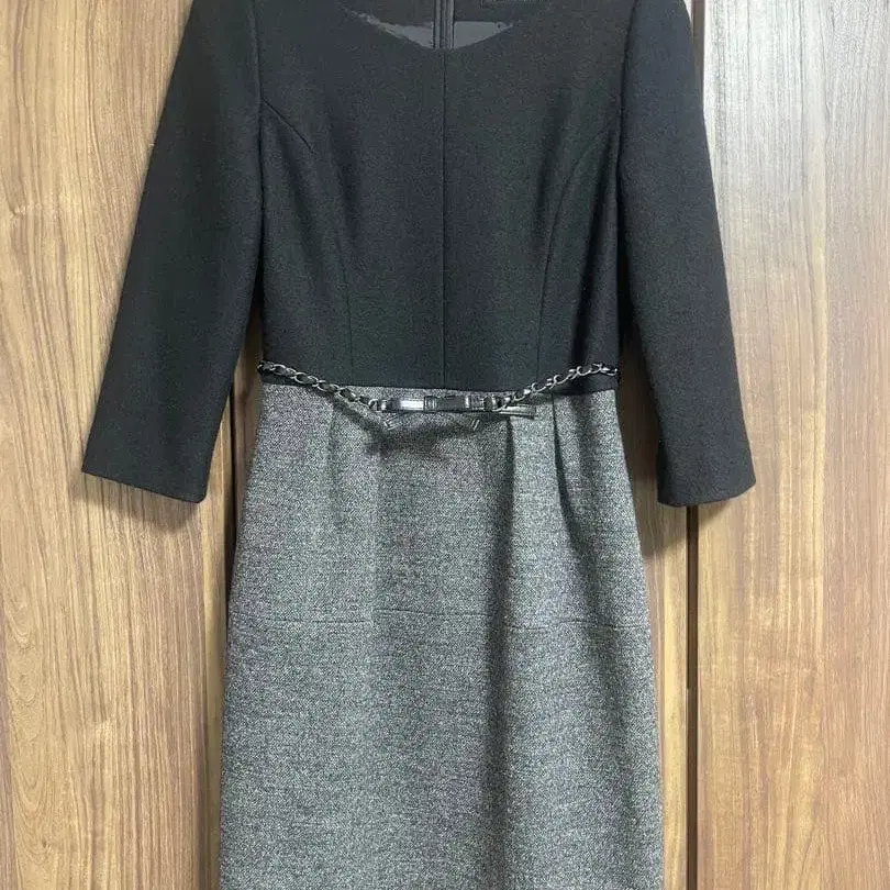 블랙과 그레이 색상의 무릎 기장 원피스, 7부 소매, 리본 체인 벨트가 있어 귀엽습니다. - 브랜드: STRAWBERRY-FIELDS - 색상: 블랙, 그레이 - 디자인: 체인 벨트 포함 - 소매 길이: 7부 소매 - 스타일: 무릎 기장 원피스 방문해 주셔서 감사합니다.