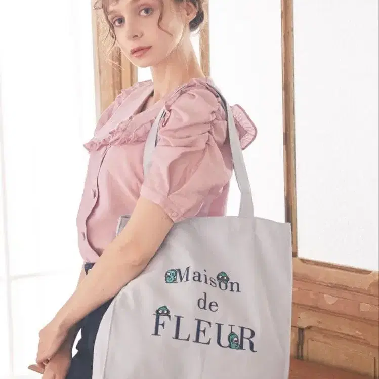 Maison de FLEUR 로고에서 빼꼼 얼굴을 내밀거나, 로고에 기대어 있는 한교동 자수로 표현한 토트백.