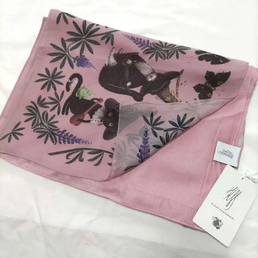 클라우스 하파니에미의 직사각형 고양이, 나비, 꽃무늬 스카프 패턴 부분은 실크 100% 무지 부분은 레이온 100% 사이즈 - 약 66 x 150 컴팩트하게 접어서 발송해 드립니다.