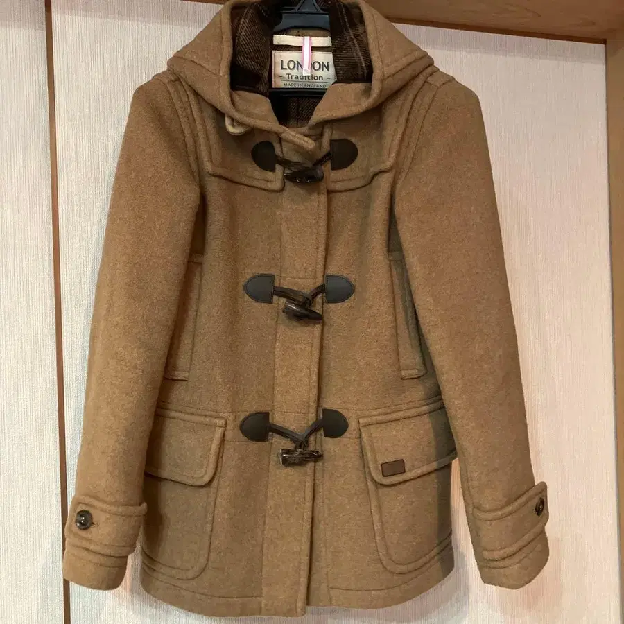 런던 트래디션의 더플 코트입니다. 안감의 체크 무늬가 멋스러운 제품입니다.