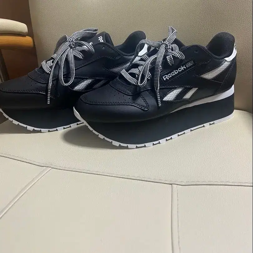 통굽 디자인의 Reebok 스니커즈, 스타일리시한 블랙/화이트 컬러. - 브랜드: Reebok - 색상: 블랙/화이트 - 스타일: 플랫폼 스니커즈 - 디자인: 레이스업 - 특징: 통굽 밑창 ( 5cm ) 오리지널 케이스에 담아 발송 방문해 주셔서 감사합니다.