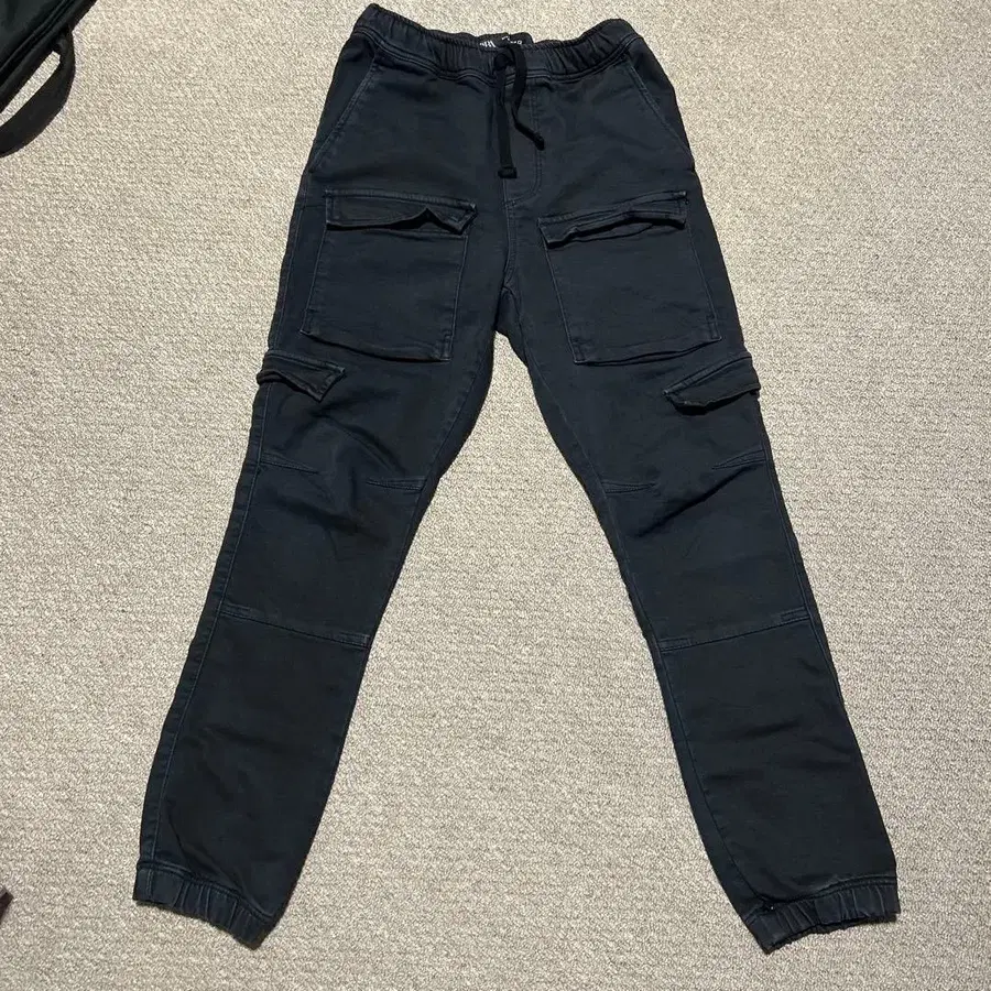 ZARA의 코튼 카고 팬츠입니다. 색상은 블랙이며 사이즈는 S입니다. 허리와 밑단은 밴딩 처리되어 있습니다. 실측치수는 허리 33, MAX 43, 밑위 앞 33 뒤 36, 인심 69, 밑단 폭 12입니다. 착용감은 맨투맨 조거 팬츠와 비슷합니다. 색 빠짐은 있을 수 있으나, 흠집이나 얼룩은 보이지 않습니다.