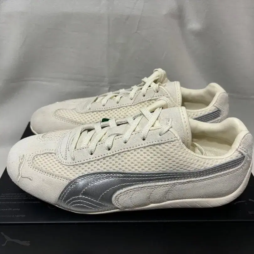 푸마 스피드캣 프리미엄 천연 가죽 스웨이드 메쉬 아이보리 실버 품번 403902-01 23cm 미사용 새상품 택 포함 상자 뚜껑 부분이 없으므로 상자 없이 포장하여 배송합니다. 미사용품이지만 오른쪽 발 앞부분에 약간 희미한 오염이 있습니다(사진 7 화살표 부분).