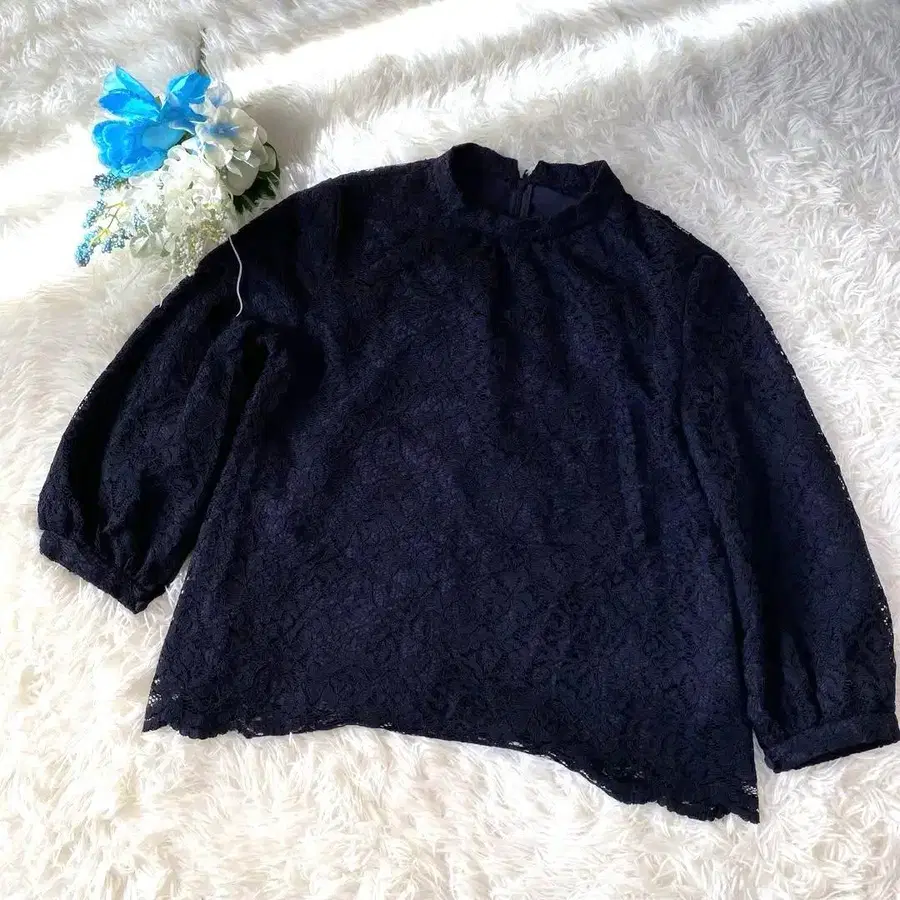 네이비 색상의 레이스 소재로, 하이넥과 벌룬 슬리브가 특징인 긴팔 블라우스입니다.