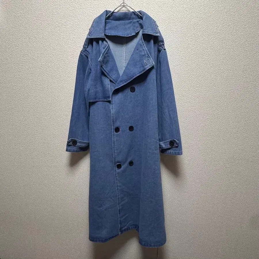 데님 블루 더블 브레스트 트렌치 롱 코트