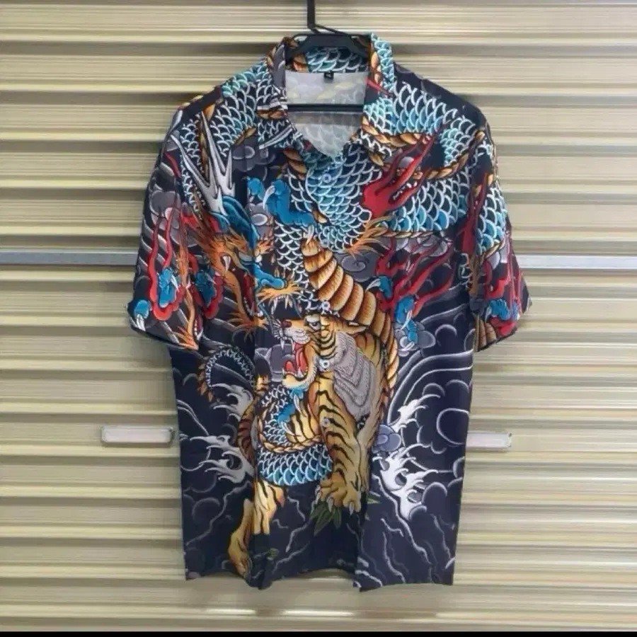 용호 일본풍 패턴 하와이안 셔츠 문신 화려한 블랙 XL 컬러풀 빅 프린트