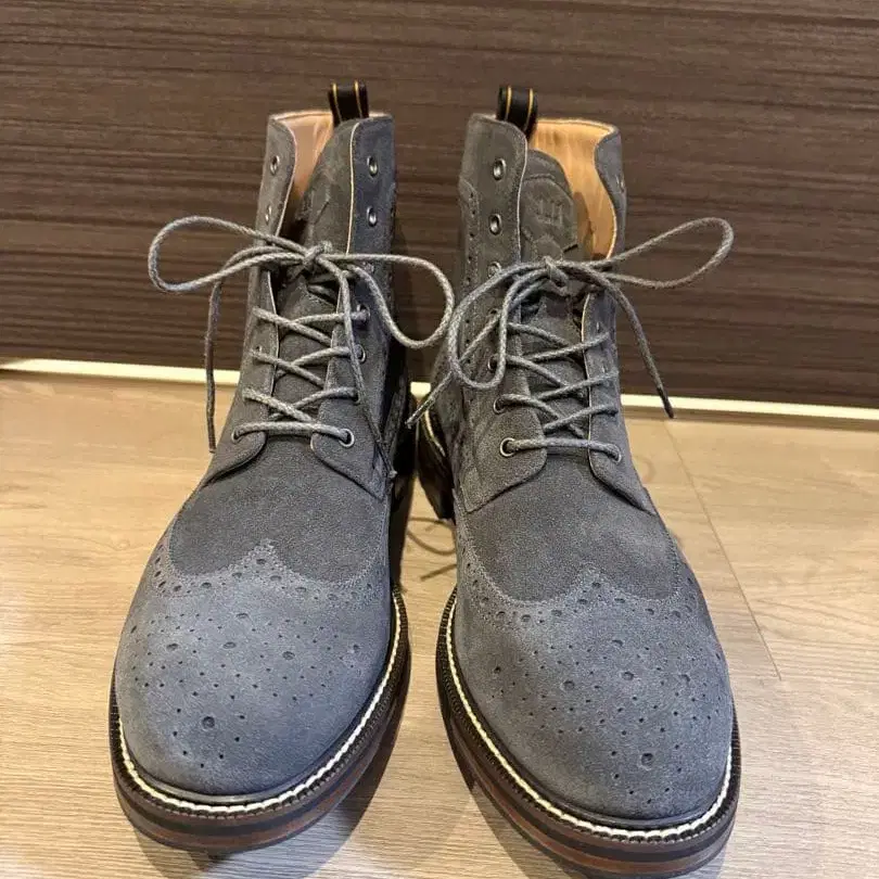 고급 그레이 스웨이드에 윙 팁과 브로그 (구멍 장식)를 더한, 클래식하면서도 세련된 디자인입니다.