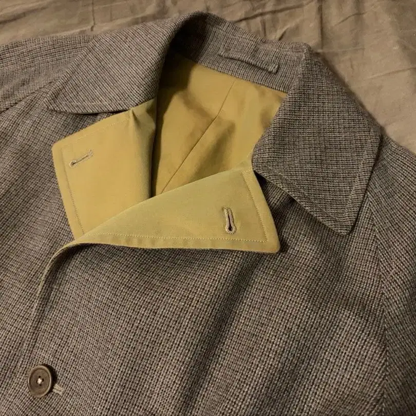 A면은 울에 알파카 25%를 혼방한 부드러운 트위드 마이크로 체크 무늬이며, B면은 탄력과 힘이 있고, 가을스러운 군고구마 같은 색감의 코튼 100% 개버딘 원단으로, 기분에 따라 착용하실 수 있습니다.