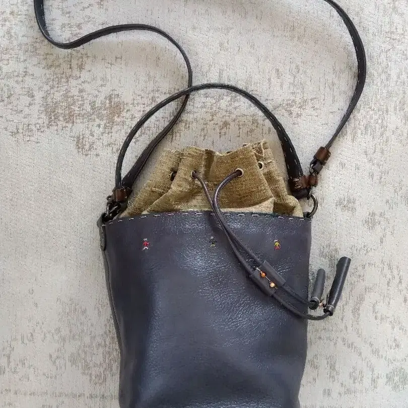 오미노의 귀여운 자수가 많이 들어간 가죽+천 타입입니다. 네이비만큼 진하지는 않지만, 차분한 블루 계열의 색감으로 코디하기 좋습니다.