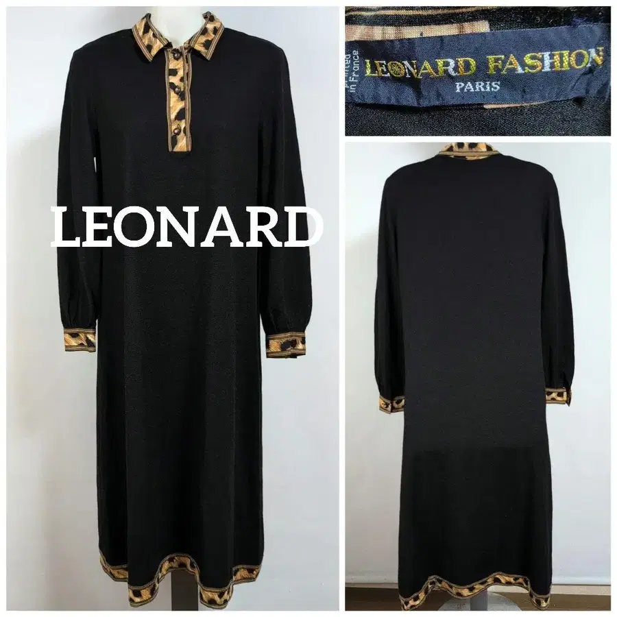 레오나르 레오파드 무늬 옷깃 블랙 긴팔 니트 원피스