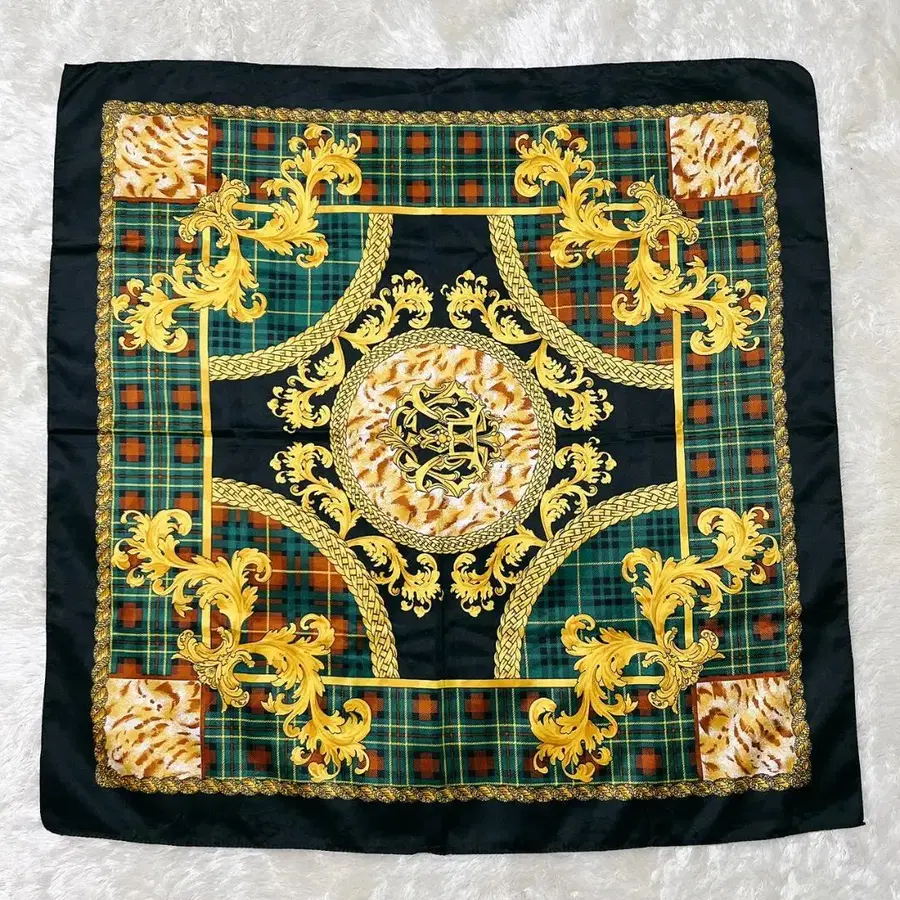 깊이 있는 블랙을 베이스로, 그린 계열의 타탄 체크 패턴, 네 모퉁이의 호랑이 무늬(애니멀 무늬), 그리고 화려한 골드 바로크풍 당초 무늬가 조합된 매우 개성적인 대형 스카프입니다. 여러 패턴이 어우러진 디자인은 고급스러움과 모던함을 동시에 갖추고 있어 코디의 중심이 됩니다. 목뿐만 아니라 가방 장식 등으로도 활용하기 좋은 대형 사이즈입니다.