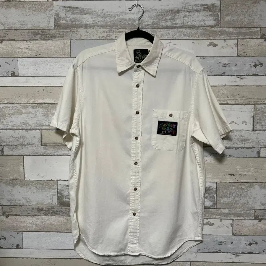 화이트 80년대 반팔 셔츠, Goofy 자수 로고 부착. - 색상: 화이트 - 브랜드: Disney - 모델명: Goofy - 디자인: 포켓 부착, 자수 로고 어깨 너비 - 47cm 가슴 너비 - 57cm 소매 길이 - 23cm 기장 - 78cm 빈티지 구제 의류이므로 노클레임/노리턴입니다.