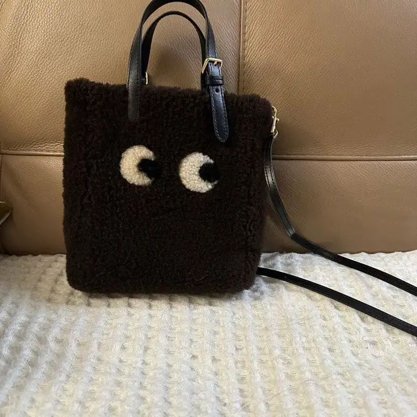 퍼 소재의 다크 브라운 숄더백, 눈 디자인이 특징적입니다. - 브랜드: ANYA HINDMARCH - 색상: 다크 브라운 - 디자인: 눈 디자인 - 소재: 퍼 소재 - 로고: ANYA HINDMARCH 방문해 주셔서 감사합니다.