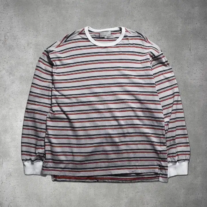 캐주얼한 화이트 베이스에 빨간색, 검은색, 파란색 스트라이프 디자인의 긴팔 티셔츠.