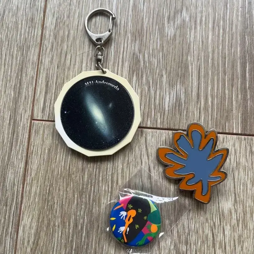 천체 관측을 테마로 한 키링과 배지 세트. - 키링: 천체 관측 디자인의 키링 - 배지: 컬러풀한 디자인의 배지 allege - 배지: 심플한 디자인의 배지 마티스 - 키링: 별자리판 디자인의 키링 - 배지: 오렌지 컬러 잎 디자인의 배지 방문해 주셔서 감사합니다.