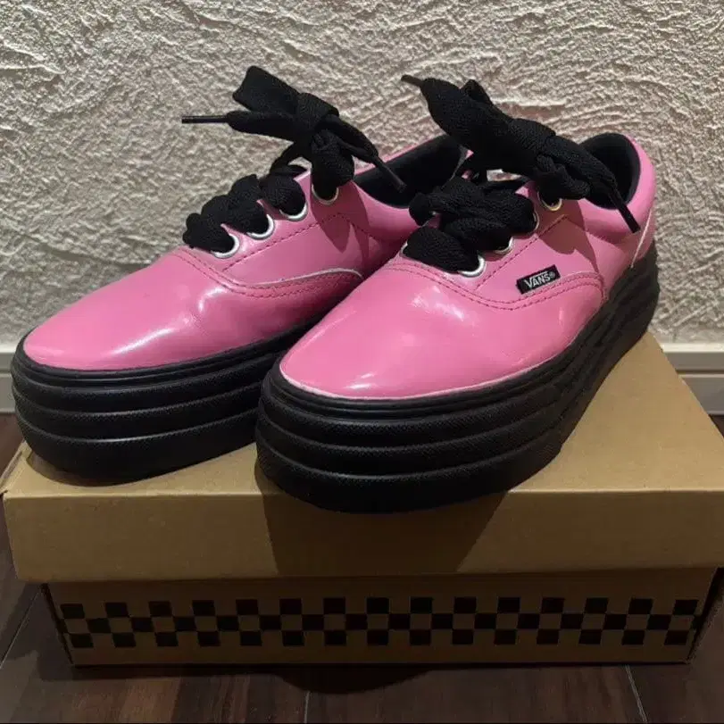 핑크색 합성 피혁 소재의 통굽 스니커즈, 블랙 색상의 신발끈 포함. - 브랜드: Vans - 색상: 핑크 - 스타일: 통굽 스니커즈 - 소재: 합성 피혁 - 신발끈: 블랙 - 밑창: 블랙 방문해 주셔서 감사합니다.