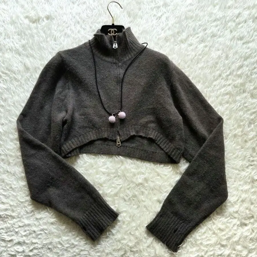 한국 패션 한국 아이돌 상의 디자이너 브랜드 Y 크롭 더블 지퍼 더블 패스너 니트 가디건 고급스러움 Y2K 트렌드 가을/겨울 어스 컬러 아름다운 스타일 아름다운 실루엣 하이웨스트