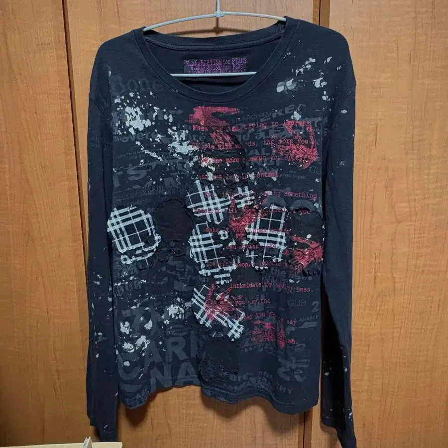 그래픽 프린트와 데미지 가공이 특징인 롱 슬리브 티셔츠.