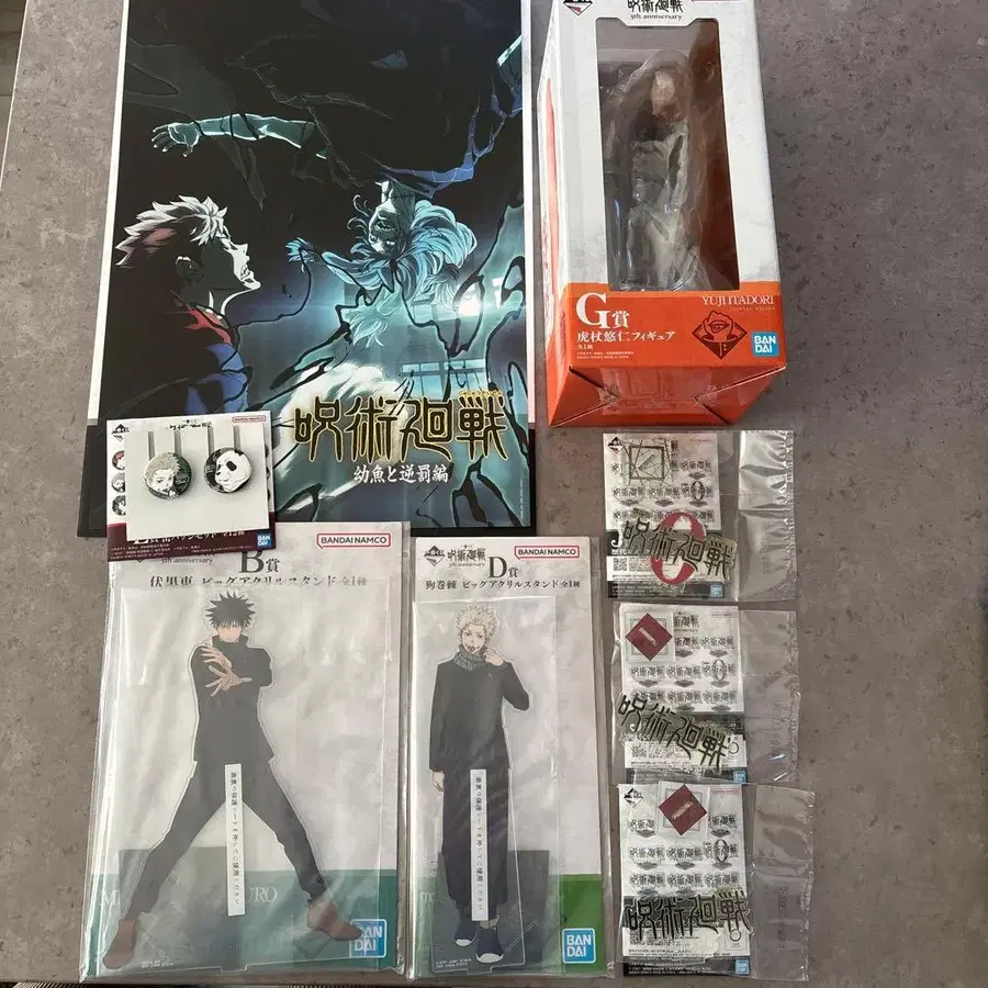 제일복권 주술회전 5th anniversary B상 후시구로 메구미 빅 아크릴 스탠드 D상 이누마키 토게 빅 아크릴 스탠드 G상 이타도리 유우지 피규어 I상 역대 키 비주얼 포스터 J상 역대 로고 아크릴 스탠드 3종 L상 캔뱃지 세트 내용물 확인을 위해 한 번 개봉했습니다.