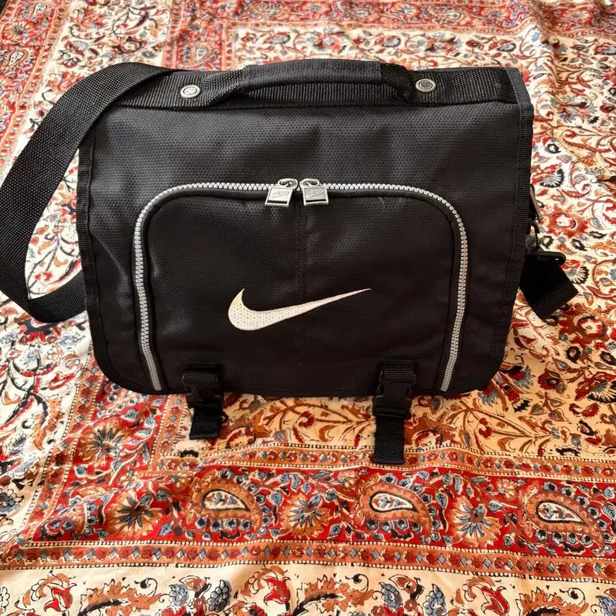나일론 소재의 블랙 메신저 백, 지퍼 포켓과 조정 가능한 숄더 스트랩이 특징입니다. - 브랜드: Nike - 색상: 블랙 - 디자인: 지퍼 포켓 - 스트랩: 조정 가능한 숄더 스트랩 - 소재: 나일론 - 특징: 플랩 디자인 방문해 주셔서 감사합니다. 높이 26 너비 37 바닥 11