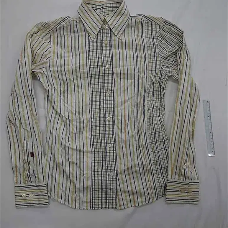 스트라이프와 체크 디자인이 특징인 긴팔 와이셔츠. - 색상: 스트라이프 (노랑, 파랑, 화이트) - 소매 길이: 긴팔 - 디자인: 체크 무늬와 스트라이프의 조합 - 뒷면 디자인: 스트라이프 이어짐 - 커프스 디자인: 스트라이프 커프스 기장: 70 어깨 너비: 44 가슴 너비: 50 소매 길이: 61 1510290033552 20251106 방문해 주셔서 감사합니다.