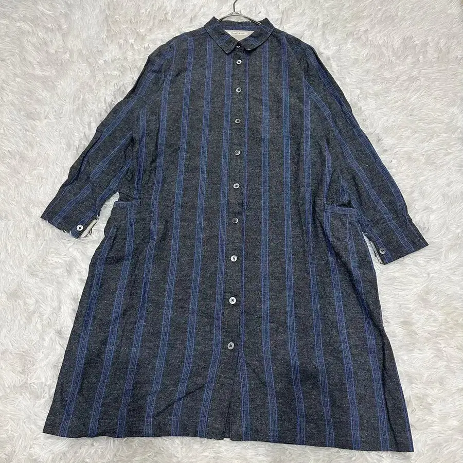 써니클라우드 그레이와 파랑 스트라이프 셔츠 원피스 린넨 코튼 M