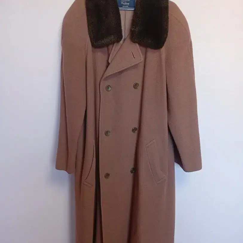 울 소재의 더블 브레스트 코트로, 퍼 카라가 부착되어 보온성과 스타일을 동시에 갖추었습니다.