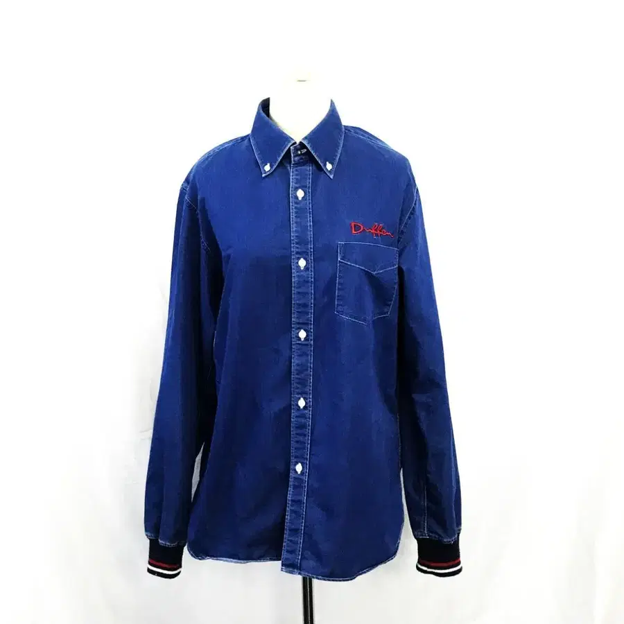 색상은 인디고이며, 왼쪽 가슴에 빨간색 실 자수가 포인트로 되어 있습니다.