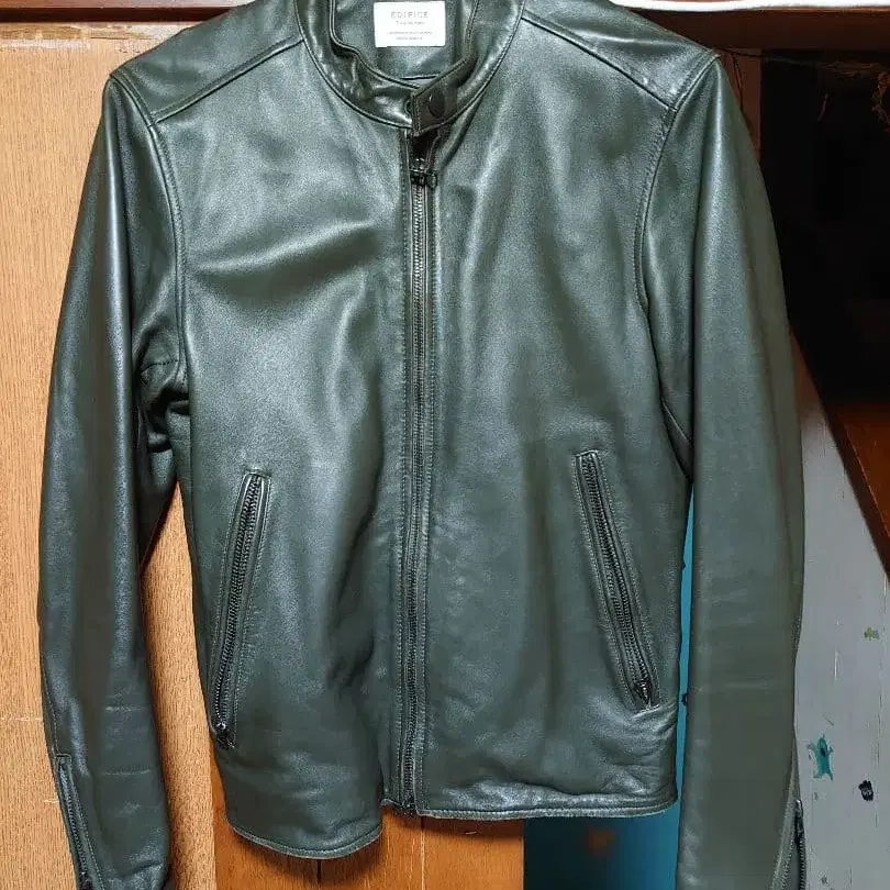 올리브 그린 색상의 가죽 싱글 라이더 자켓입니다. 프론트 지퍼와 사이드 포켓이 있습니다. 약간의 색 벗겨짐이 있지만 가죽이 멋스럽게 마무리되었습니다. 저는 단단한 체격으로 딱 맞습니다.