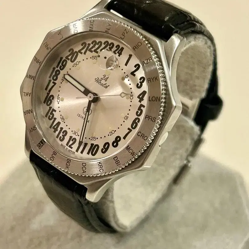 SEIKO 세이코 인스투르 남성용 쿼츠 24시간 손목시계 작동품 새상품 배터리 교체 완료 100년 일기 등으로 알려진 이시하라 주식회사가 세이코 인스투르 주식회사에 위탁 제조하여 탄생한 시계입니다. 케이스는 개운의 팔각형 모양이며, 1회전 24시간 표시, 세계 주요 도시의 시간을 파악할 수 있습니다. 레어한 24시간 World 시계입니다. 상태 케이스, 버클은 긁힌 자국 정도, 방풍 흠집 없음. 벨트는 약간 노후화가 보여 수리 및 연마 작업을 하였습니다. 사진으로 확인해 주세요. 사이즈 (cm) 페이스 세로 4.4 가로 3.8 손목 둘레 17~21 중고품임을 이해해 주시길 부탁드립니다. #SEIKO