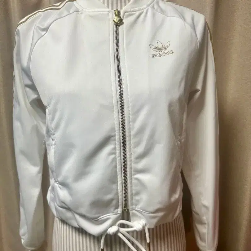 아디다스 오리지널스 슈퍼스타 탄생 50주년 기념 모델 트랙탑, 화이트&골드입니다. 쓰리 스트라이프의 골드가 빛나고 있습니다. 지퍼 부분의 형태가 슈퍼스타 신발의 쉘 디자인으로 되어 있습니다. 50주년 기념 패치는 허리 옆 위치에 달려 있습니다. 자세히는 모르지만, BLACKPINK가 광고에서 착용한 것 같습니다. 2회 착용만 한 새 상품급입니다. 방문해 주셔서 감사합니다. 표기 사이즈 S 어깨 너비 39~40cm (래글런이므로 대략적인 수치입니다) 가슴 너비 43cm 기장 45cm 소매 길이 약 56cm (래글런이므로 대략적인 수치입니다) 동일 타입의 다른 색상, 블랙&골드도 판매 중입니다. 사진은 9호 토르소 마네킹에 착용시킨 것입니다.