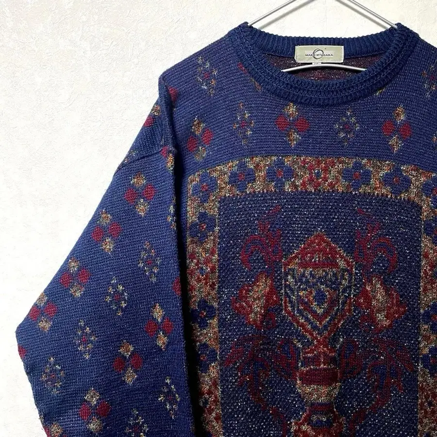 • 빈티지 블루 올 패턴 기하학 민족 무늬 디자인 니트 스웨터