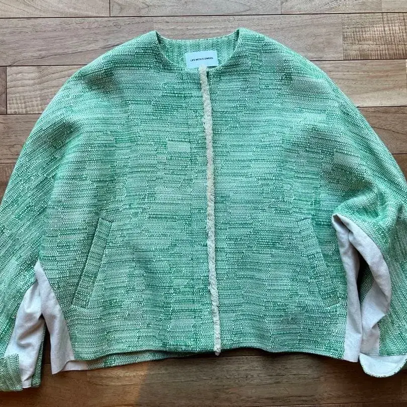 life with flowers 트위드 소재 품질 택이 없어 정확히는 모르겠지만 면 린넨과 같은 천연 소재입니다. 여유로운 실루엣으로 고급스러운 블루종입니다. 기장 57cm, 화장 73cm, 가슴 너비 60cm 미사용이지만 개인 보관이므로 사소한 점이 신경 쓰이는 분은 구매를 자제해주세요. 60,000엔 정도였습니다.
