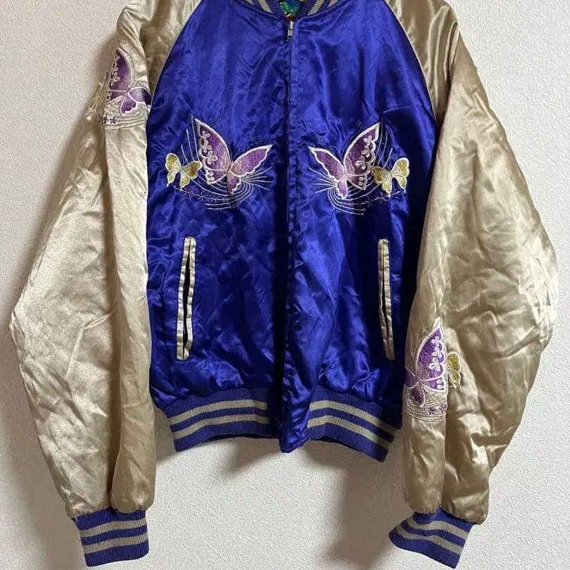 자동 번역되었어요. 원문보기파랑색과 금색 새틴 원단에 나비와 꽃 자수가 놓인 스카잔.
