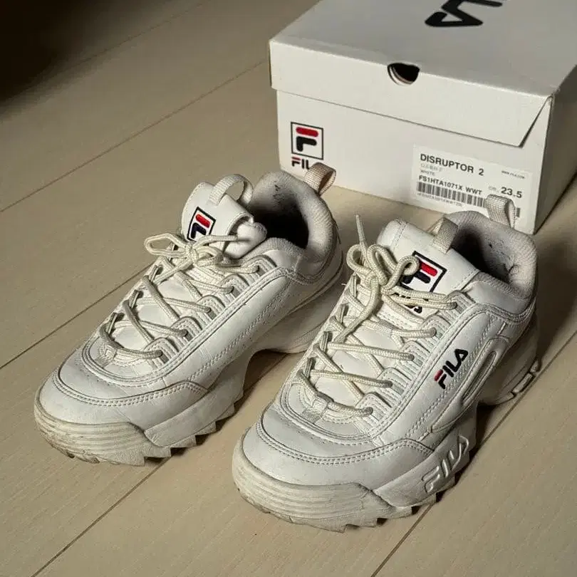 FILA의 DISRUPTOR 2는 스타일리시한 화이트 디자인과 쾌적한 착용감을 제공합니다. 약간의 얼룩이 있지만, 한 번도 관리하지 않았기 때문에 관리에 따라 깨끗해져 새상품에 가까운 상태가 될 것이라고 생각합니다. - 브랜드: FILA - 모델명: DISRUPTOR 2 - 사이즈: 23.5 - 색상: 화이트 방문해 주셔서 감사합니다.