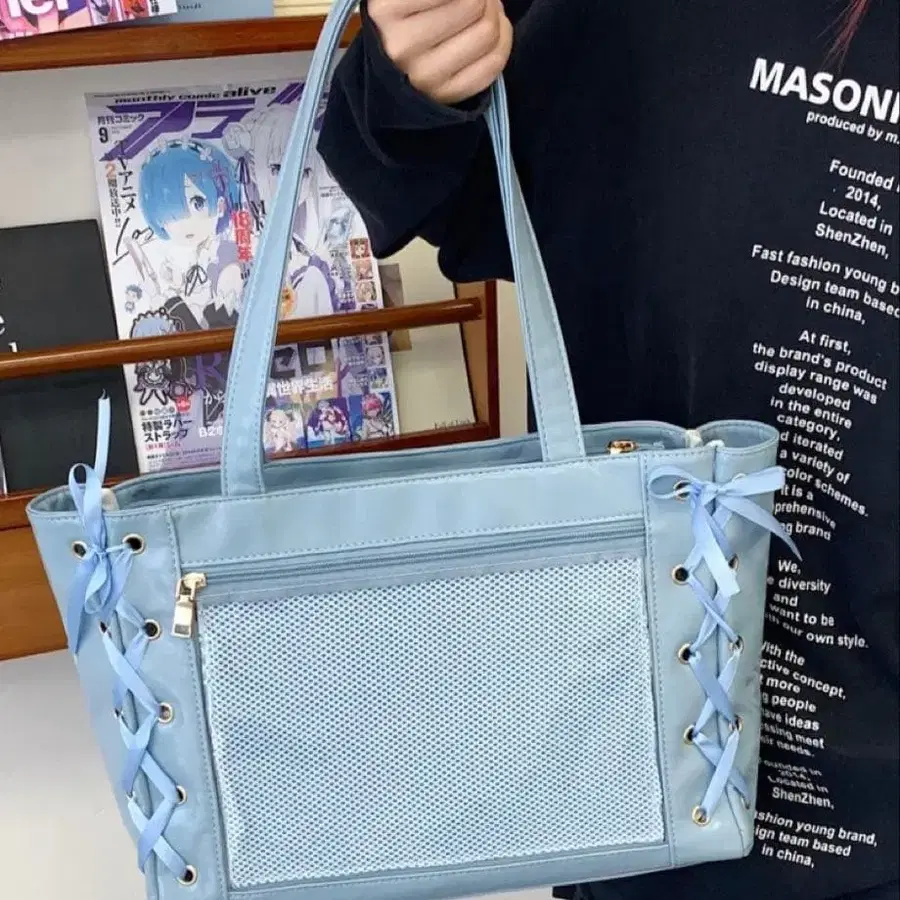 레이스업 리본 이타백 이타백 A4 사이즈 이타백 이타백 보여주는 가방 덕질 덕질 데코 가방 커스텀 가방 최애 활동 지뢰계 지뢰 천사계 패션 엔젤코어 토트백 오로라 색상 - 블루 계열 얼룩, 찢김 등 - 없음