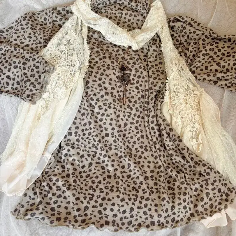 Y2K 레오파드 무늬 7부 소매 티셔츠 모리걸 헤이세이 레트로