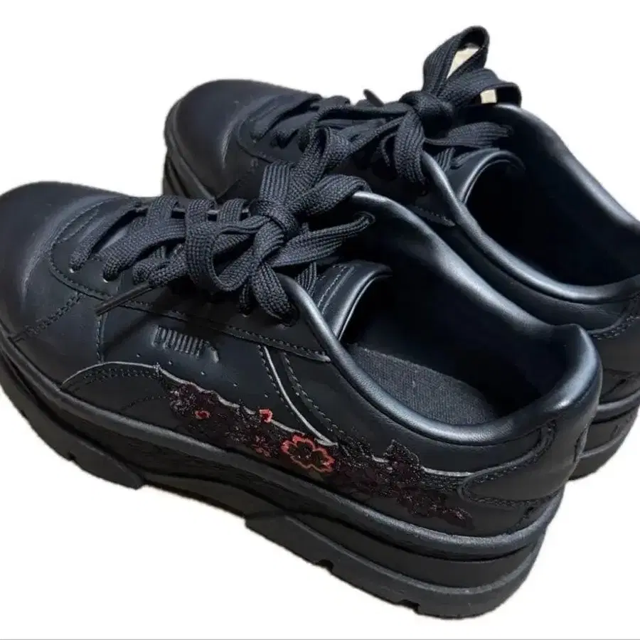 자수 디자인의 블랙 플랫폼 스니커즈. - 색상: 블랙 - 디자인: 자수 디자인 - 스타일: 플랫폼 스니커즈 얼룩, 찢김, 냄새 등 - 없음 색상 - 블랙 계열 2025년 9월에 푸마 샵에서 구매. 한 번 신었지만 사이즈가 맞지 않아 보관. 상태는 좋지만, 한 번 신었기 때문에 완벽을 추구하시는 분은 삼가해 주세요. 상자 없음. 간편 포장으로 발송해 드리니 양해 부탁드립니다. 이사 관계로 연초에는 매장으로 가져갈 예정이니, 관심 있으신 분은 서둘러 주세요 ^^