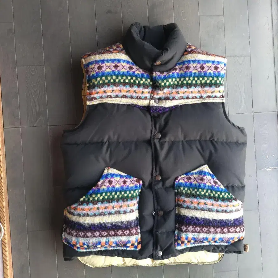 다색 니트 디자인이 특징인 다운 베스트, 따뜻함과 스타일을 동시에 잡았습니다. - 색상: 블랙과 다색 니트 - 디자인: 다운 베스트, 니트 부분 포함 - 소재: 겉감: 나일론, 안감: 폴리에스테르, 60/40 - 포켓: 앞면에 2개의 포켓 있음 80 다운 20 페더 방문해 주셔서 감사합니다. 어깨 너비 약 43cm 가슴 폭 약 54cm 뒷면 기장 약 63cm