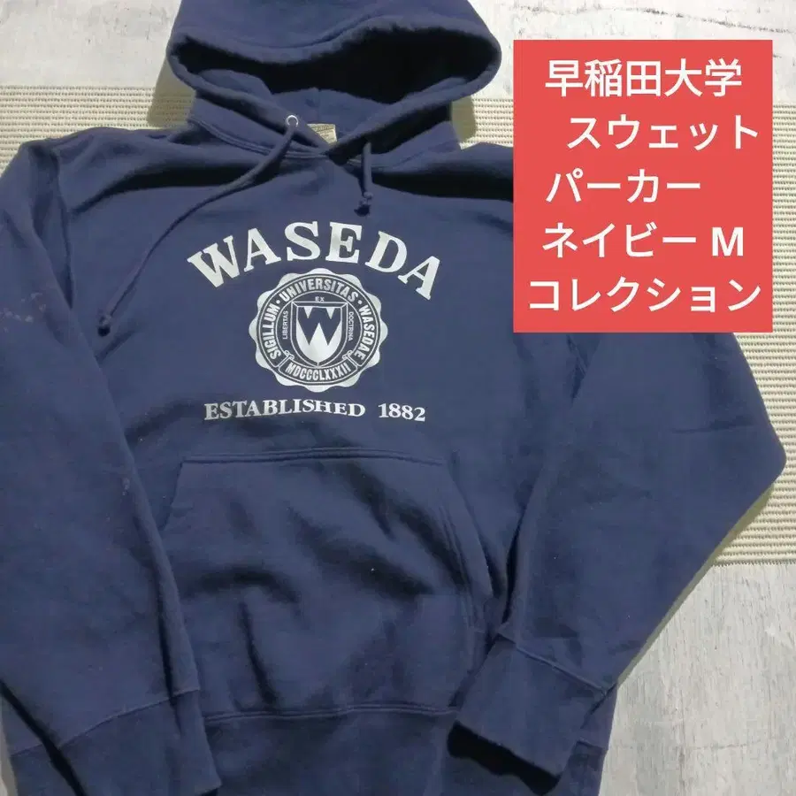 WASEDA의 1882년 설립을 기념하는 네이비 색상의 후드티.