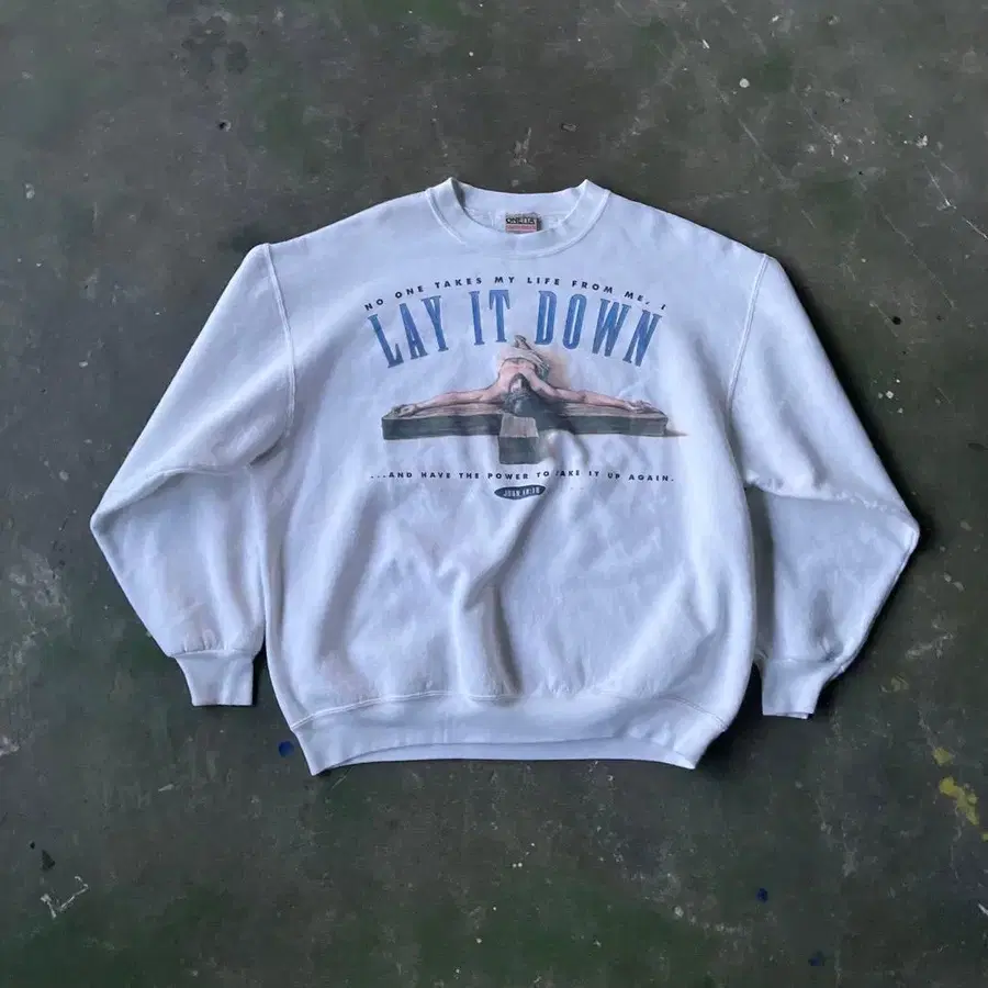 ONEITA 예수 그리스도 맨투맨 usa제 90s 화이트 성경 NO ONE TAKES MY LIFE FROM ME, I LAY IT DOWN - AND HAVE THE POWER TO TAKE IT UP AGAIN. JOHN 10:18 사이즈 xl 어깨 너비 61 가슴 너비 64 기장 65