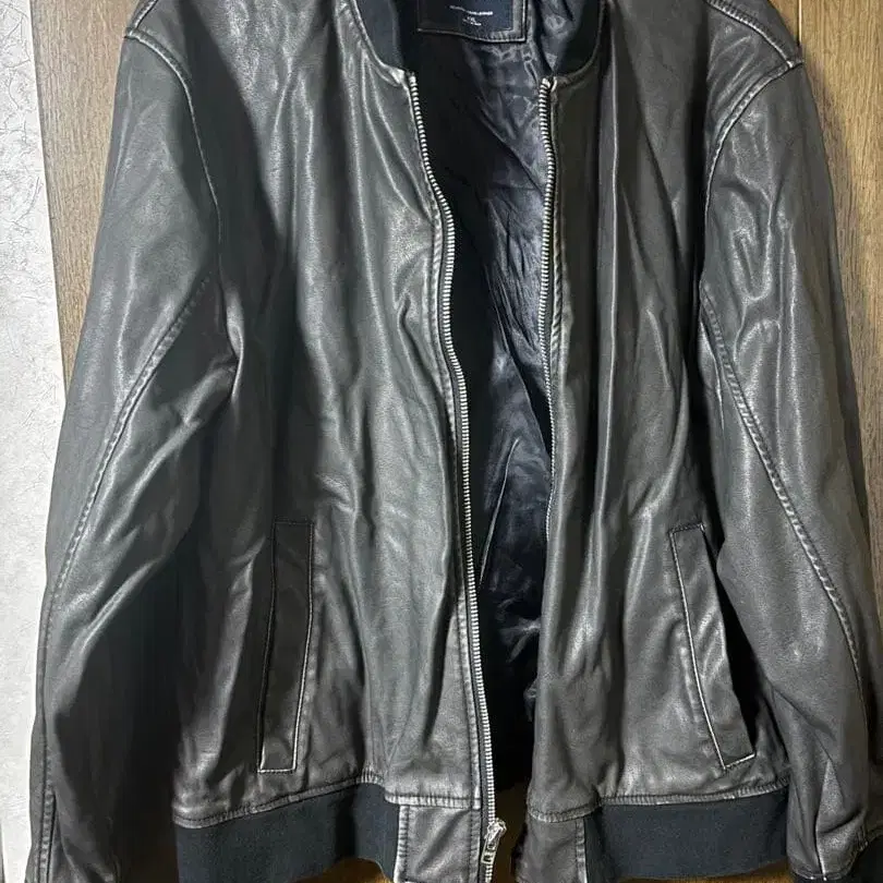 다크 그레이의 인조 가죽 봄버 자켓, 스탠드 카라와 사이드 포켓이 있습니다.