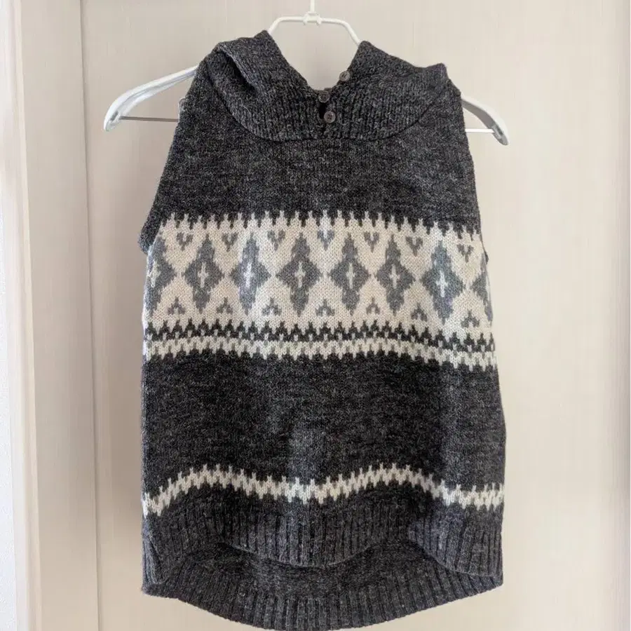 TANG TANG! 후드 부착 니트 베스트 컬러: 차콜 계열 사이즈: 가슴 너비 43cm, 기장 앞면 52cm, 뒷면 60cm 소재: 모 70%, 린넨 30% 몇 번 착용했지만 깨끗합니다.