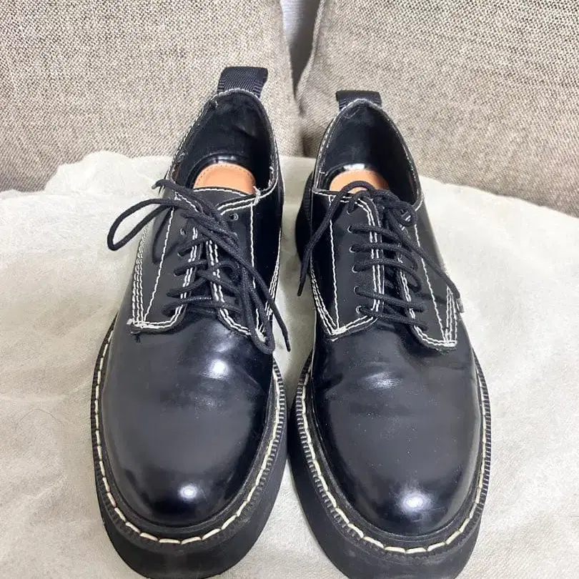 통굽 블랙 가죽 신발, 흰색 스티치가 특징입니다. - 색상: 블랙 - 소재: 가죽 - 밑창 높이: 통굽 - 디자인: 스트레이트 팁 - 장식: 흰색 스티치 - 스타일: 캐주얼 - 특징: 루프 탭 포함 방문해 주셔서 감사합니다. ZARA TRF ZARA WOMAN
