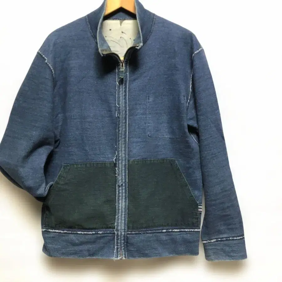 인디고 블루 색상의 아우터입니다. 지퍼가 있고 포켓이 있습니다.