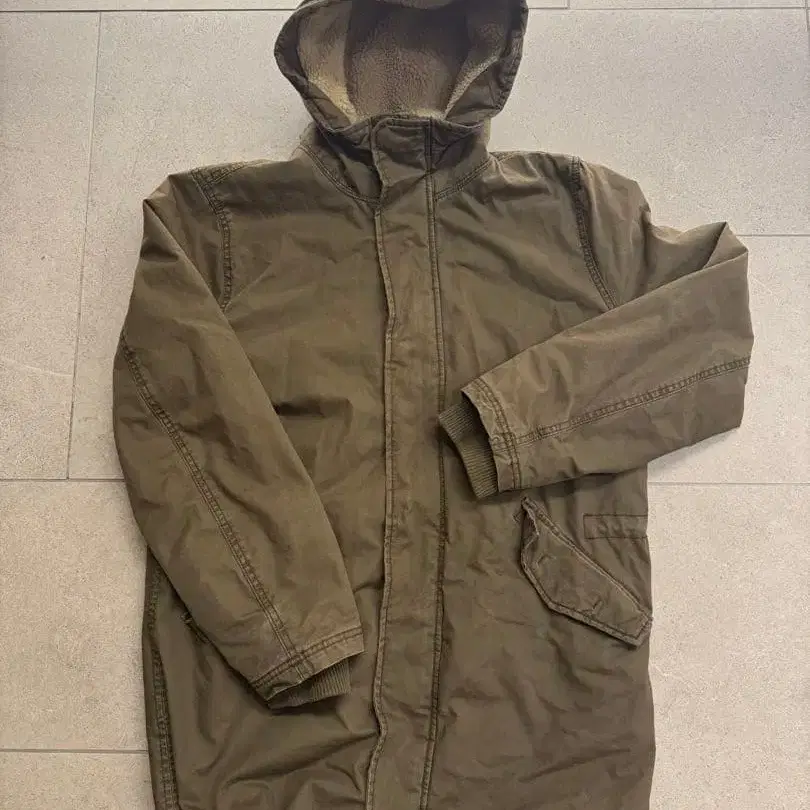 올리브 그린 더플 코트 후드 부착