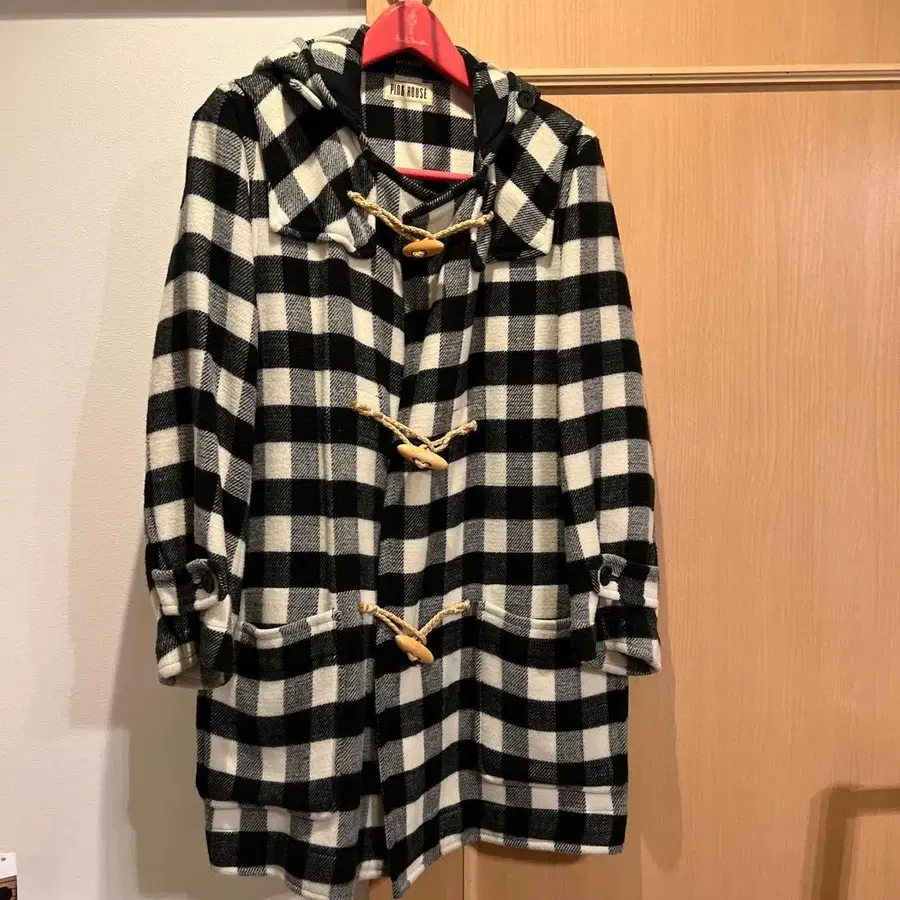 후드 부착된 블랙 화이트 체크 더플 코트, 토글 버튼 포함. - 브랜드: PINK HOUSE - 색상: 블랙 화이트 체크 - 디자인: 더플 코트 - 특징: 후드 부착, 토글 버튼 방문해 주셔서 감사합니다.