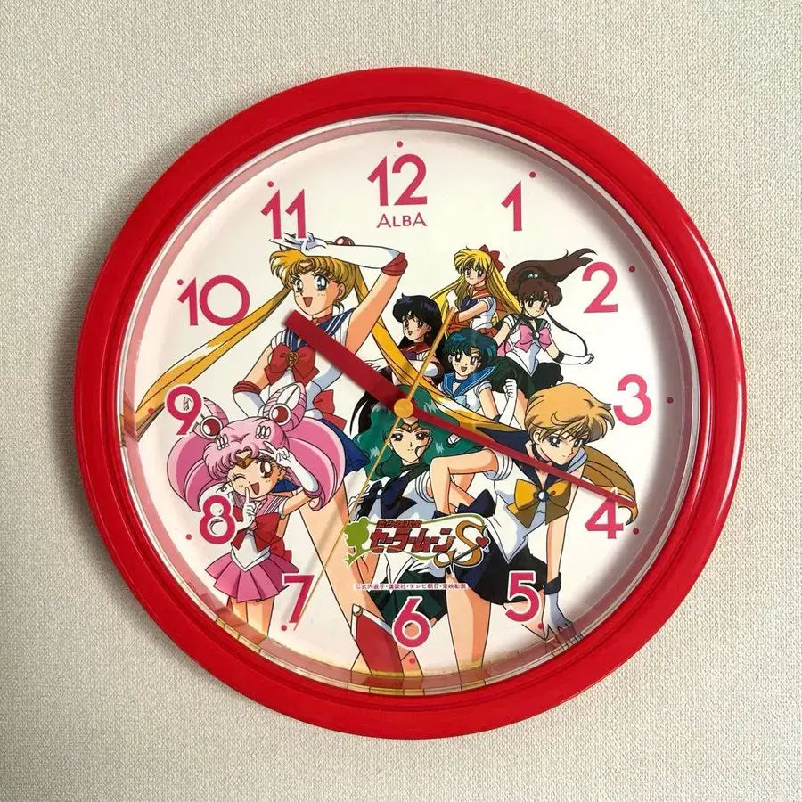 세일러문 캐릭터가 그려진 벽걸이 시계, 직경 약 30cm.