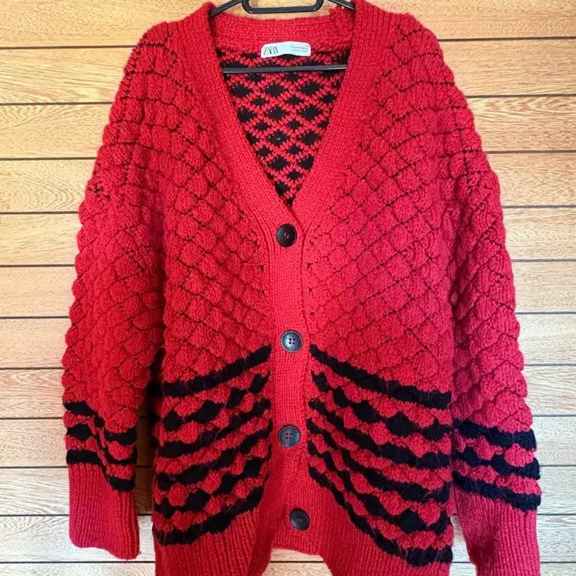 빨간색과 블랙의 뜨개질 무늬가 특징인 두꺼운 원단의 자라 가디건 가슴 너비 67cm 기장 75cm - 브랜드: ZARA - 색상: 빨간색과 블랙 - 디자인: 뜨개질 무늬 - 스타일: 가디건 - 버튼: 프론트 오픈 버튼식 방문해 주셔서 감사합니다.